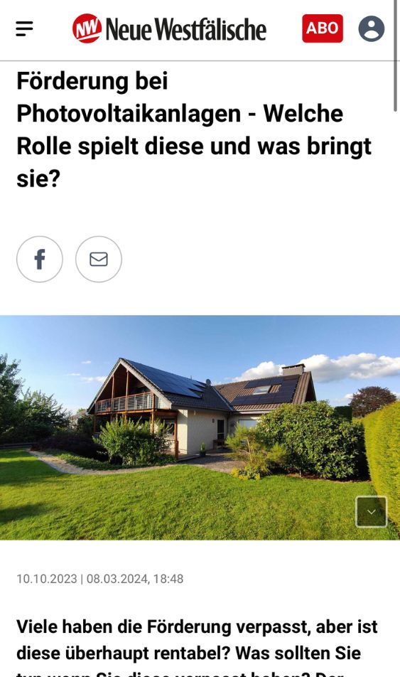 Gepostet auf Olaf Göttsch2026-04-08Trustindex überprüft, ob die Originalquelle der Bewertung Google ist. Arbeiten wurden zügig und sauber erledigt. Die Kommunikation war gut.Gepostet auf Uwe Rabe2026-04-02Trustindex überprüft, ob die Originalquelle der Bewertung Google ist. Die Firma können wir nur empfehlen. Was besprochen wird, wird auch eingehalten. Nette Mitarbeiter die einem auch alles gut erklären. Die Montage auf dem Dach war vorbildlich.Gepostet auf Dr. Frank Straube2026-03-31Trustindex überprüft, ob die Originalquelle der Bewertung Google ist. Lief wie am Schnürchen. Absprachen klar eingehalten. Netter Kontakt auf allen Ebenen. Freu mich auf SonnenstromGepostet auf Reiner Hestermann2026-03-18Trustindex überprüft, ob die Originalquelle der Bewertung Google ist. Von Anfang an ein gutes Gefühl. Beratungsprozess sehr gut gelaufen. Fragen beim Angebot wurden prompt und präzise beantwortet. Inhalt des Angebotes voll zufriedenstellend. Vom Dachaufbau bis zur Abnahme für die Einspeisung des Stroms spielte das Unternehmen seine volle Kapazität aus. Beanstandungen gab es innerhalb der gesamten Abwicklung keine. Wir können diese Firma mit seinem Konzept und seinen Mitarbeitern nur sehr empfehlen. Fortschrittlich, gute Konzeption und verantwortliche Mitarbeiter unterstützen dieses gesamte Konzept.Gepostet auf Peter Weiss2026-03-02Trustindex überprüft, ob die Originalquelle der Bewertung Google ist. Gute und freundliche Beratung bei Bestellung der Photovoltaik. Schnelle Lieferung und Montage der Geräte. Bei der Planung des Zählerwechsels leichte Verzögerung bei der Weitergabe an den StromlieferantenGepostet auf Abdullah Sarigül2026-02-20Trustindex überprüft, ob die Originalquelle der Bewertung Google ist. Ich würde gerne mehr als 5 Sterne geben. Ich kann die Firma nur weiterempfehlen. Sie hat sehr schöne und saubere Arbeit geleistet. Ich bin sehr zufrieden mit dem Ergebnis, und die Anlage läuft einwandfrei. Besonders beeindruckt hat mich auch die schnelle Ausführung – ich musste nur knapp einen Monat warten. Top Service!